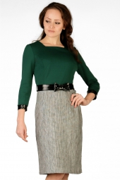 Описание: Эффектное комбинированное платье песочных оттенков из ткани "шанель" и джерси. Отделка искусственной кожей "под золото". Юбка по подкладке. Длина по спинке 100 см