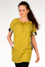 Описание: Платье-туника из джерси, свободного силуэта - элегантно своей простотой. Отделка - искусственная кожа. Интересная деталь - кармашки в швах. Рекомендуем носить с легинсами. Длина по спинке - 77 см.