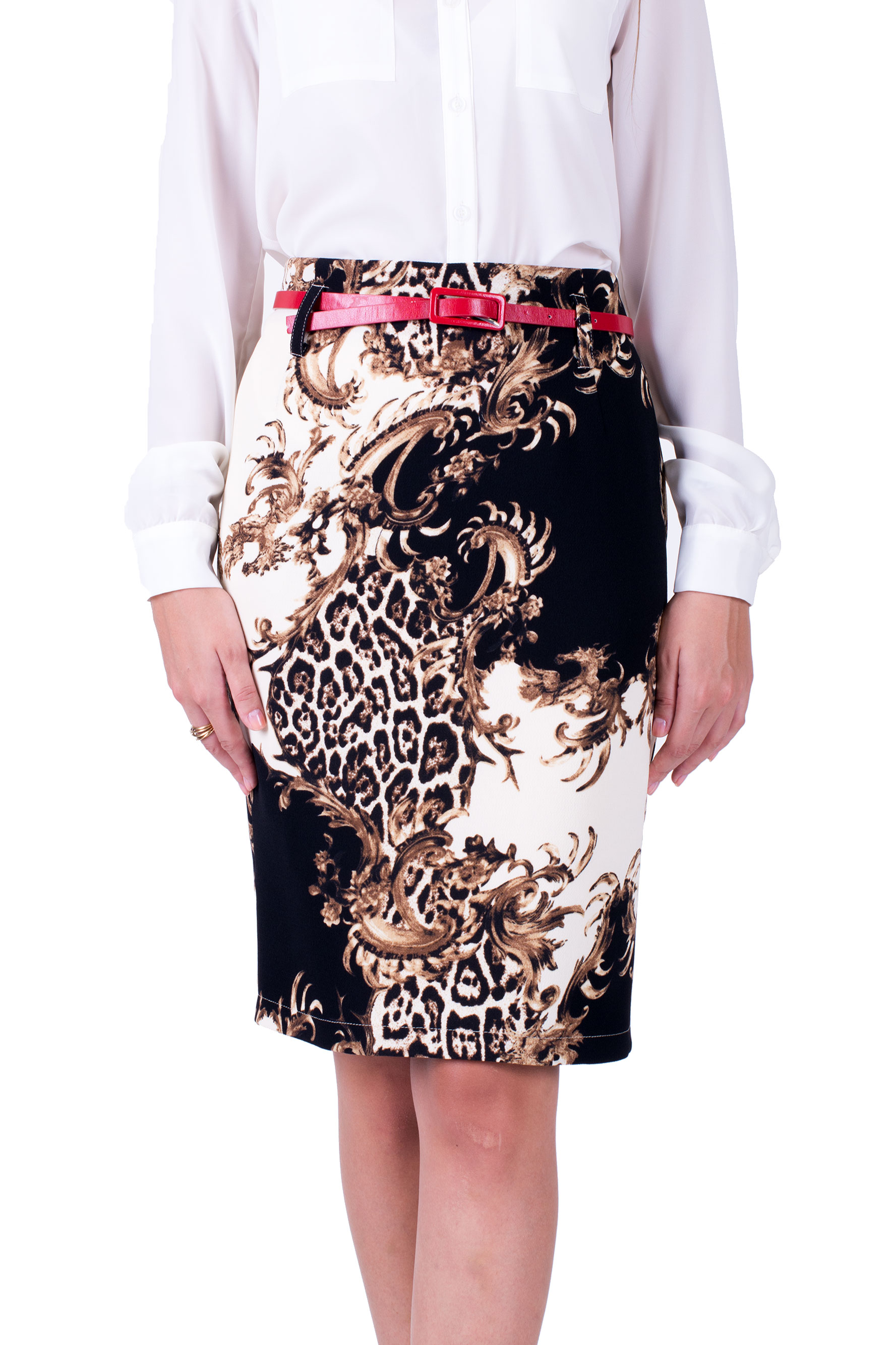 Юбка-футляр из плотного крепа на подкладе из вискозы с модным принтом. Сзади потайная молния и шлица.