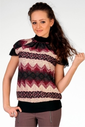 Описание: Топ из трикотажа с рисунком, в актуальных сиреневых тонах. Маленькие рукава-крылышки отделаны кружевом. На модели - с брюками R00995