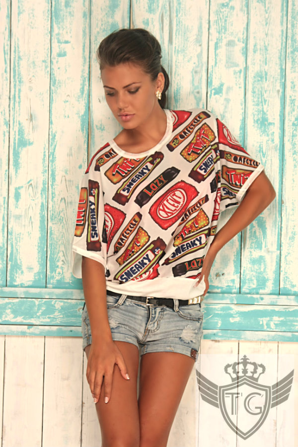 Стильная футболка шифона и украшена камушками.