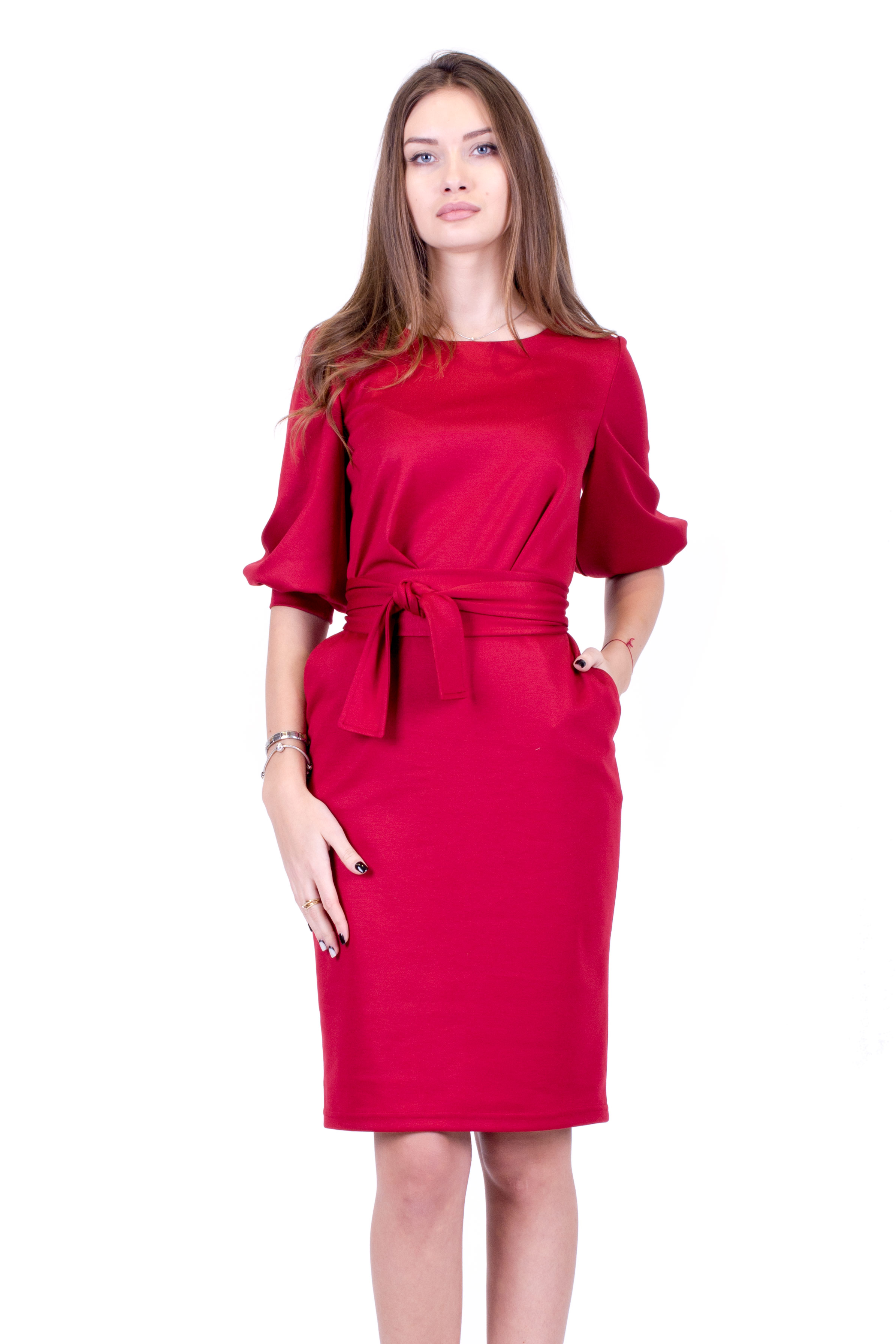 Модное, стильное платье прилегающего силуэта на потайной молнии на спинке, из "французского" трикотажа. Объемный рукав "фонарик" внизу на манжете. Отрезная линия талии с защипами, фиксируется широким поясом.