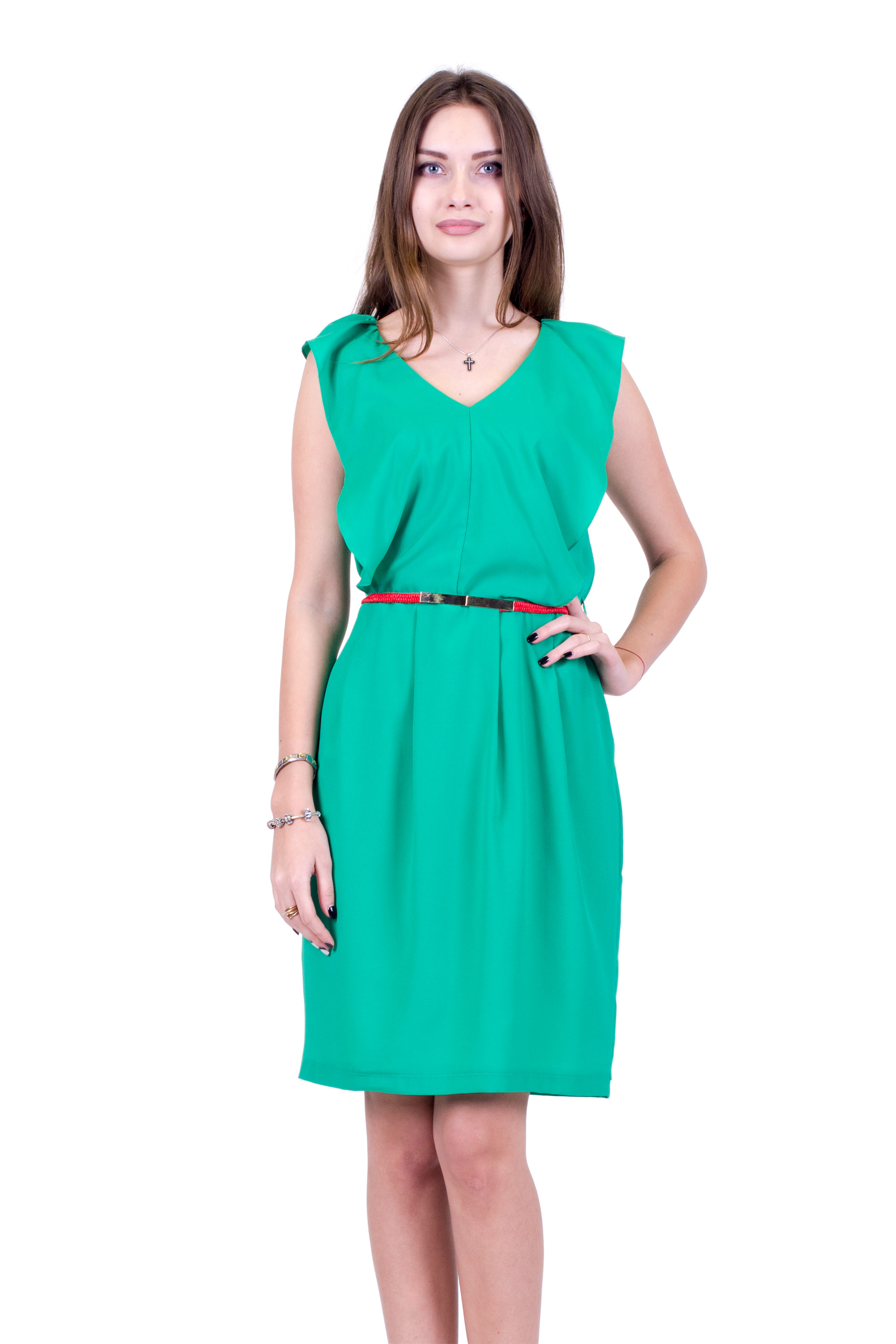 Платье из креп-шифона на трикотажной подкладе из вискозы. Прилегающего силуэта на потайной молнии. Перед украшен объемным воланом. Линия талии фиксируется декоративным поясом (ремень прилагается).