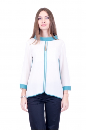 Эффектная блуза, полуприлегающего силуэта из креп-шифона с контрастной отделкой. Стойка воротник, на спинке застежка на пуговице.