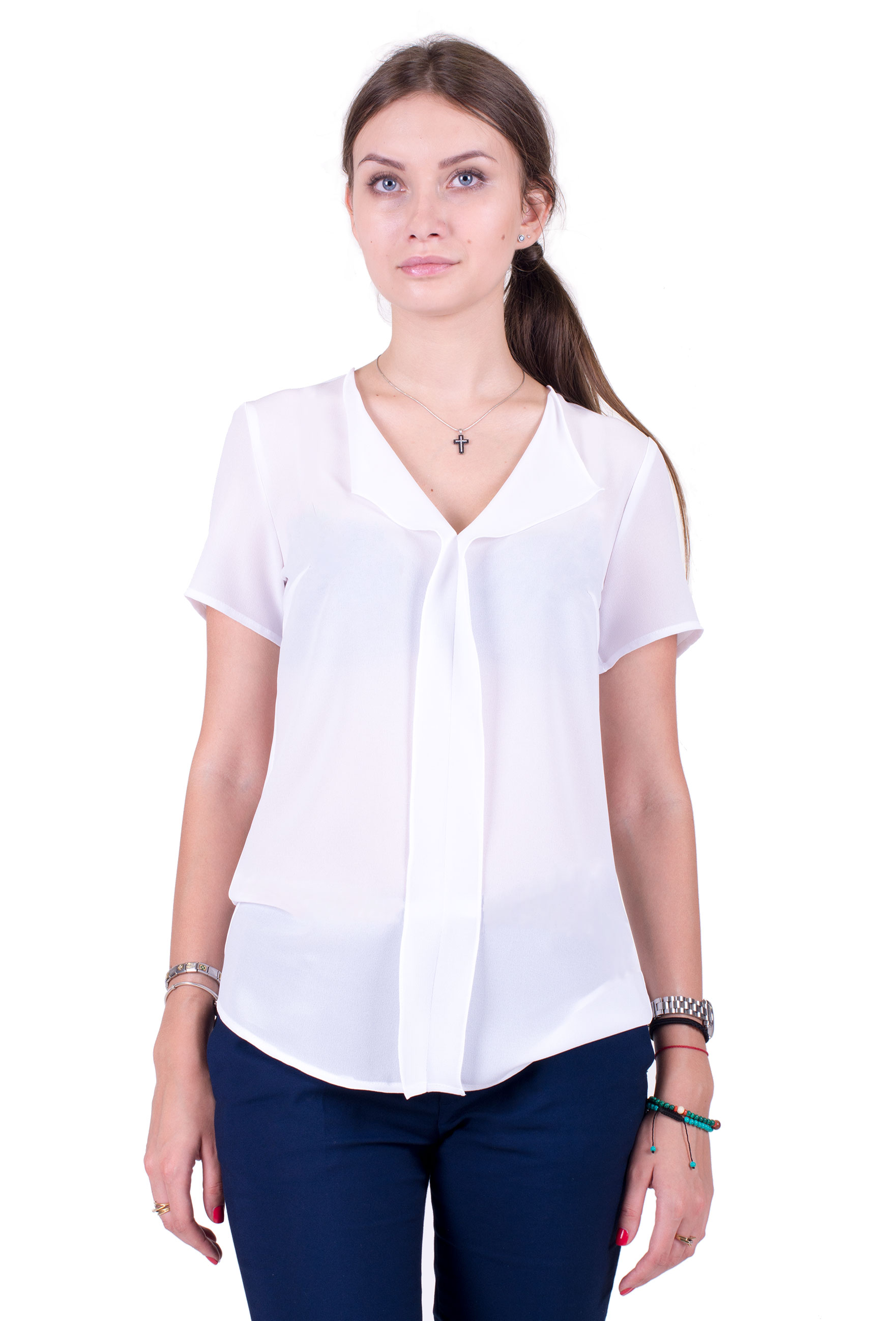 Блуза свободного кроя из нарядного "креп-шифона" с отложным воротником переходящим в планку. Спинка на кокетке со складкой.