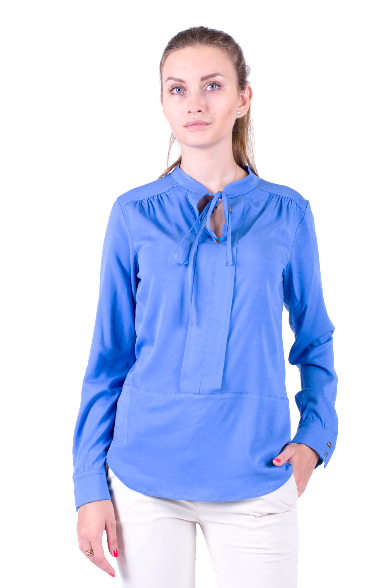 Стильная рубашка из натуральной ткани, свободного кроя. Стойка-воротник на кулиске. По переду эффектная складка по всей длине до отрезной линии талии. Спинка на кокетке с легкой сборкой, чуть длиннее чем перед.