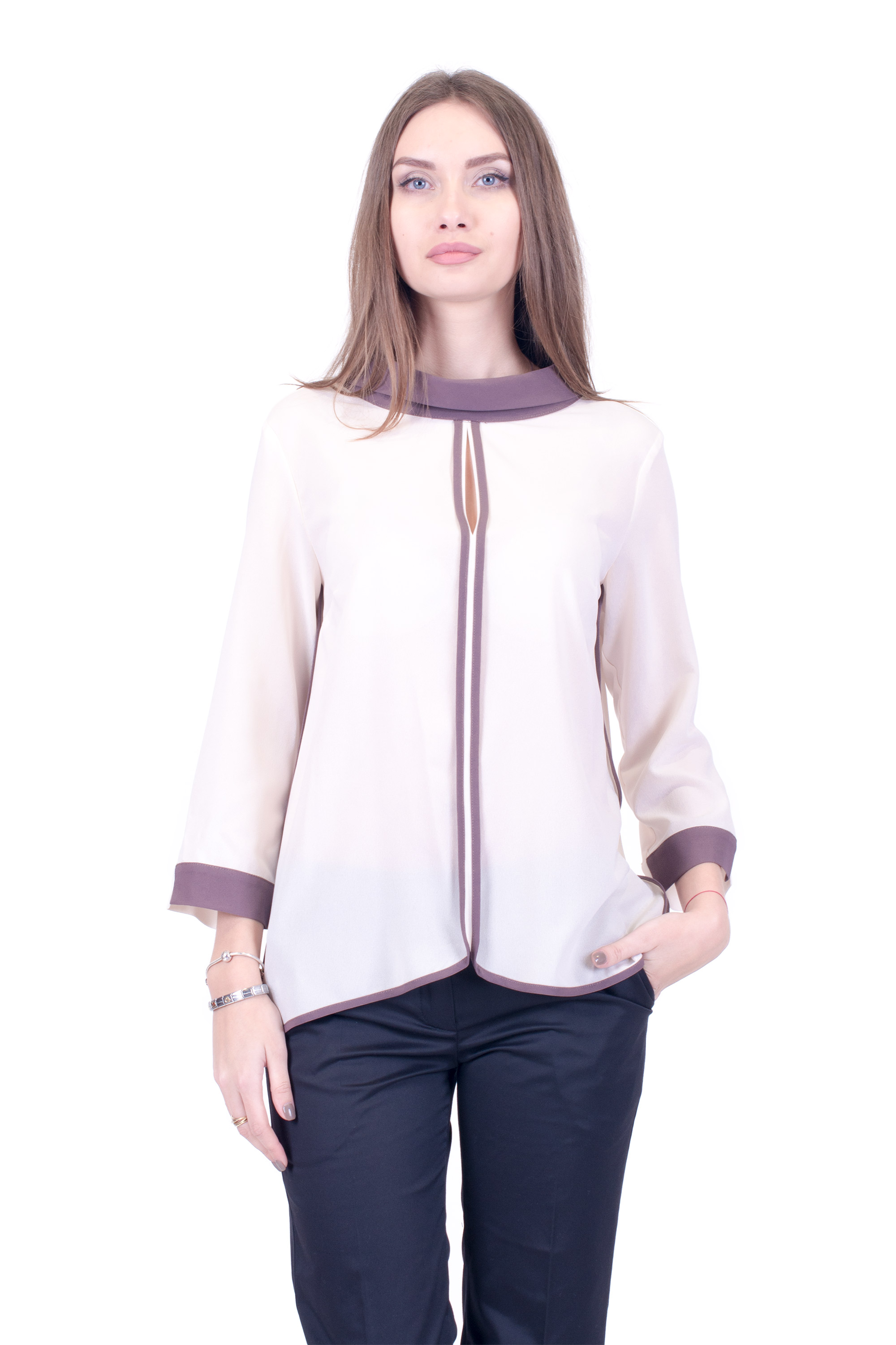 Эффектная блуза, полуприлегающего силуэта из креп-шифона с контрастной отделкой. Стойка воротник, на спинке застежка на пуговице.