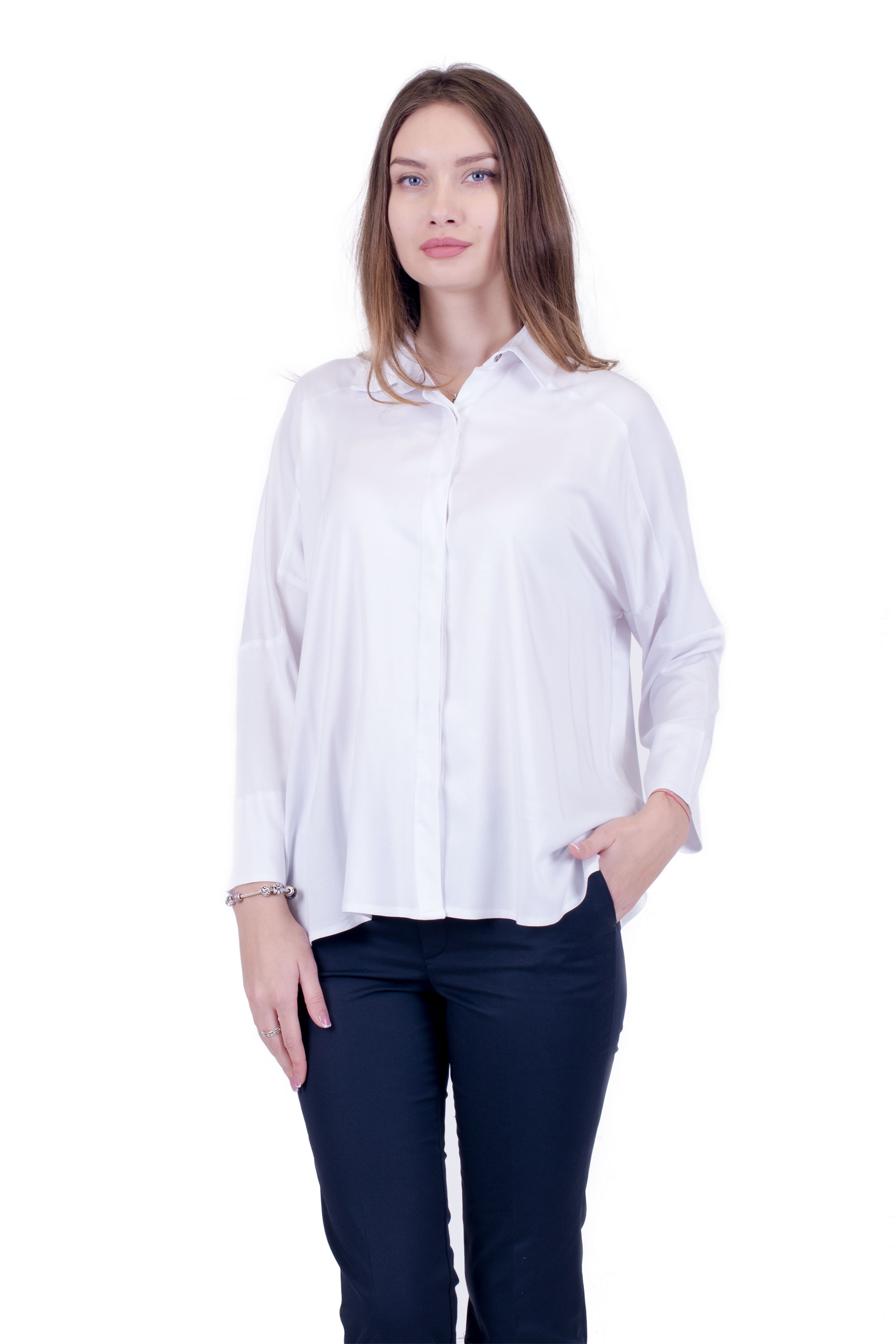 Модная, стильная рубашка свободного, сложного кроя, из натуральной, приятной к телу, ткани. На потайной планке с пуговицами.
