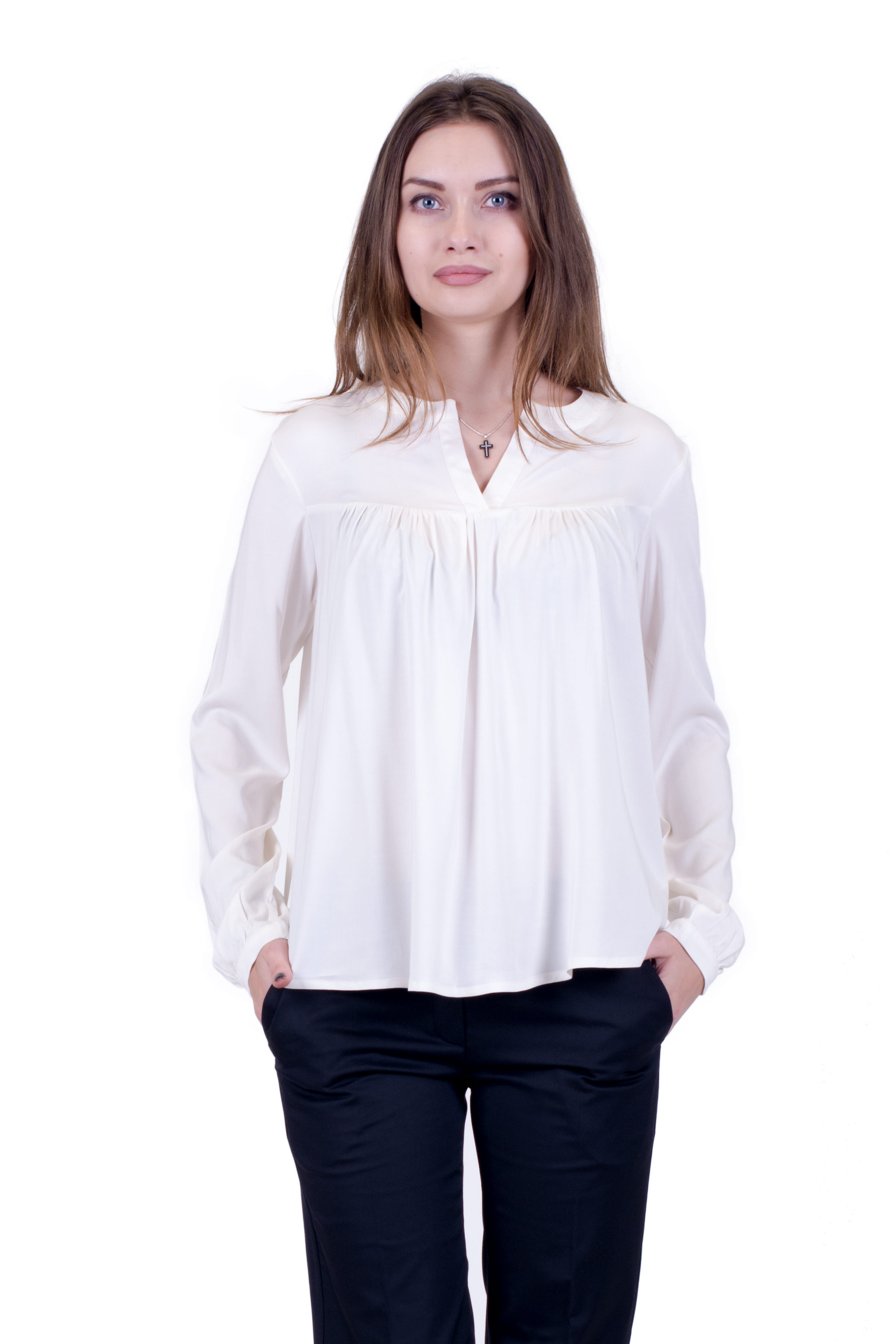 Блуза из натуральной ткани "штапель". Кокетка на планке свободного кроя, переходящая в сборку спереди и сзади.