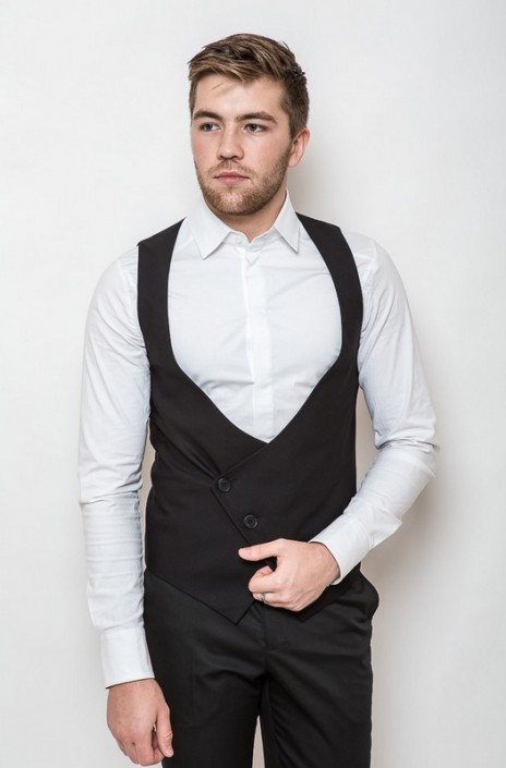Оригинальный жилет для настоящего стиляги. Глубокий вырез, необычная застежка по диагонали на три пуговицы. Приталенная модель с хлястиком на спине. Низ передних полочек оформлен углом, что позволяет зрительно вытянуть фигуру и сделать ее более статной.