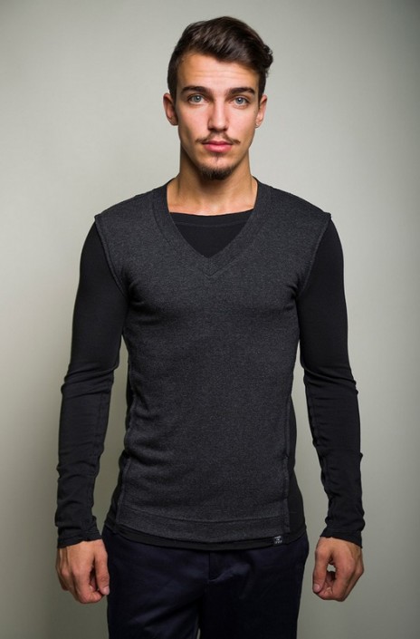 Двухцветный трикотажный свитер спереди выглядит как комплект-двойка: жилет с вырезом <<уголком>> и одетый под него, контрастный джемпер. Свитер, длиной чуть ниже талии, выгодно подчеркивает фигуру, обеспечивая абсолютное облегание.